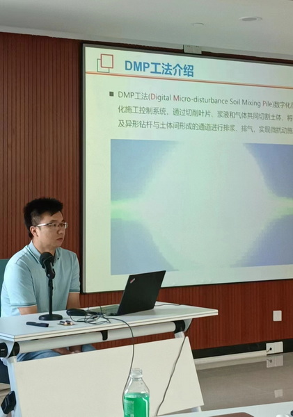 本项目是广东地区首个应用DMP工法的重大工程,吸引了众多参与方关注。DMP工法是一种自主研发的微扰动搅拌桩技术,通过采用多通道异形钻杆、多层可变角度叶片、上下转换喷浆及数字化施工控制系统,可实现成桩全过程分段自动化施工,具有水泥掺量省、置换土少、施工扰动小、数字化程度高等优点,非常适用于本项目建设。